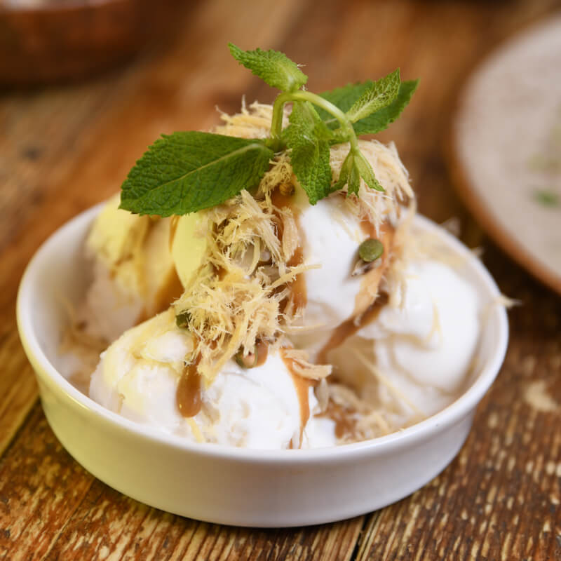 with curly halva, roasted coriander seeds, raw tahini and date honey