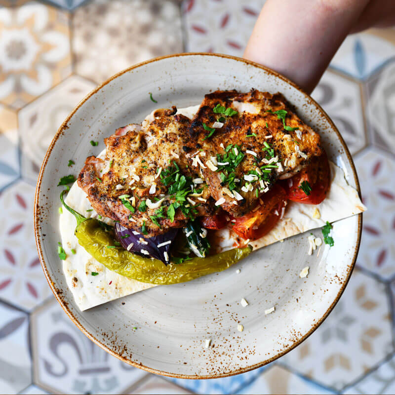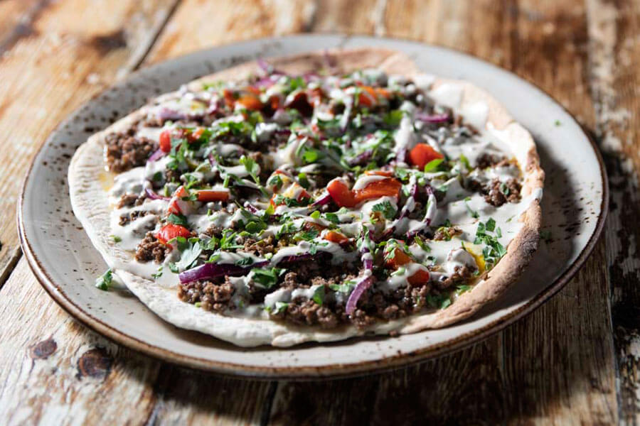 Grilled pita stuffed with minced beef, bone marrow, onion and spices, served with fresh green salad
