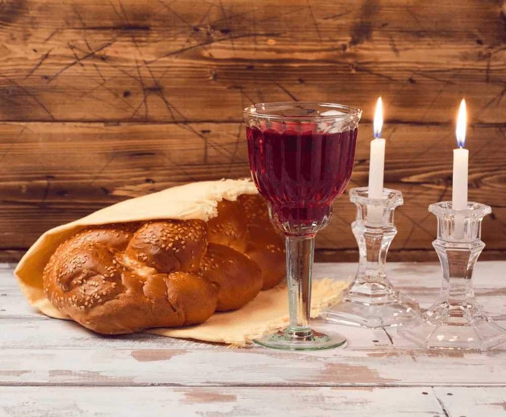 Typically Shabbat includes breaking the challah (braided bread) and a cup of wine which are both blessed before the meal begins.